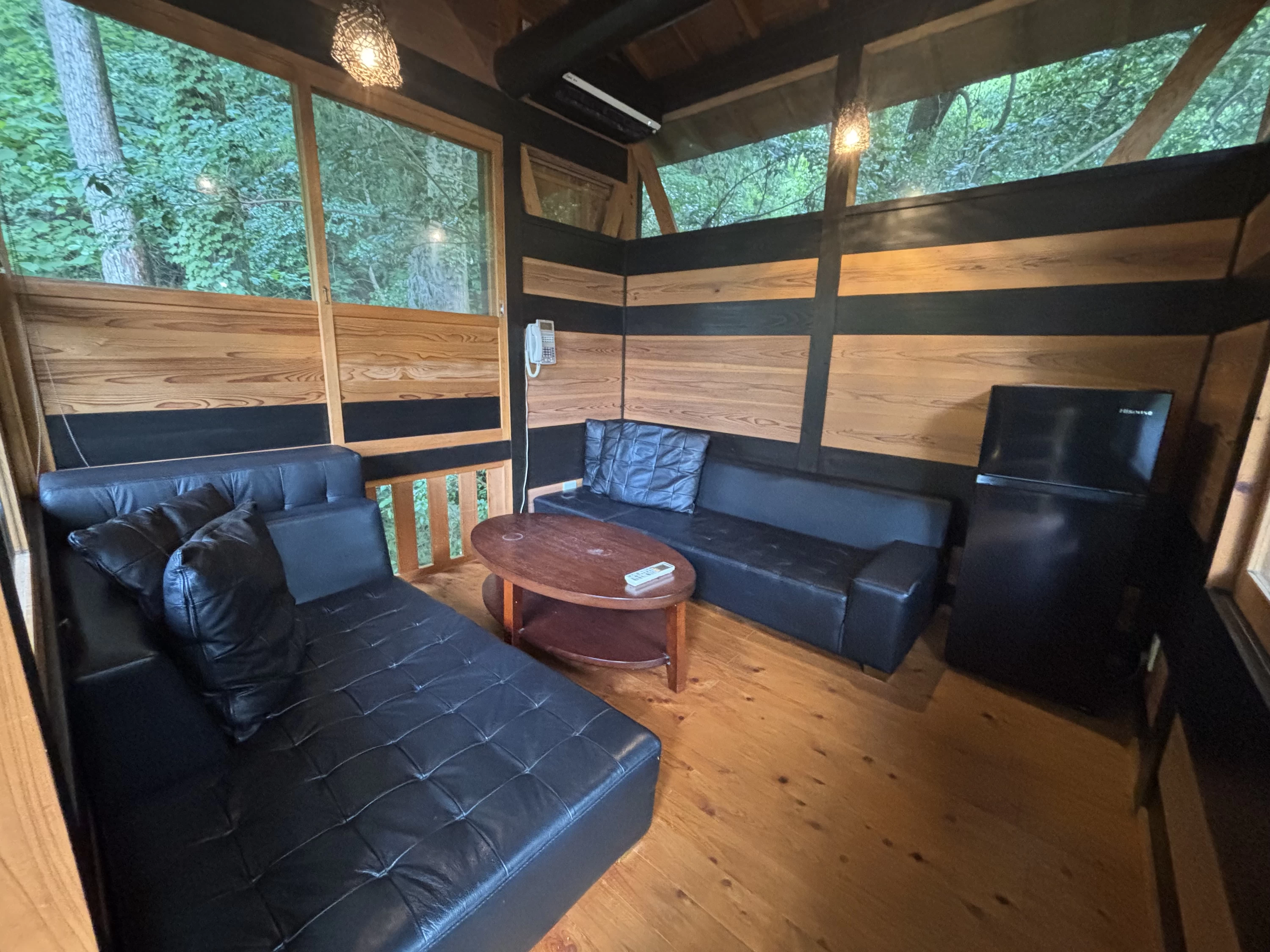 中にはテーブルとソファ、冷蔵庫が備わり、森に浮かぶ“秘密基地”のような雰囲気が漂います。