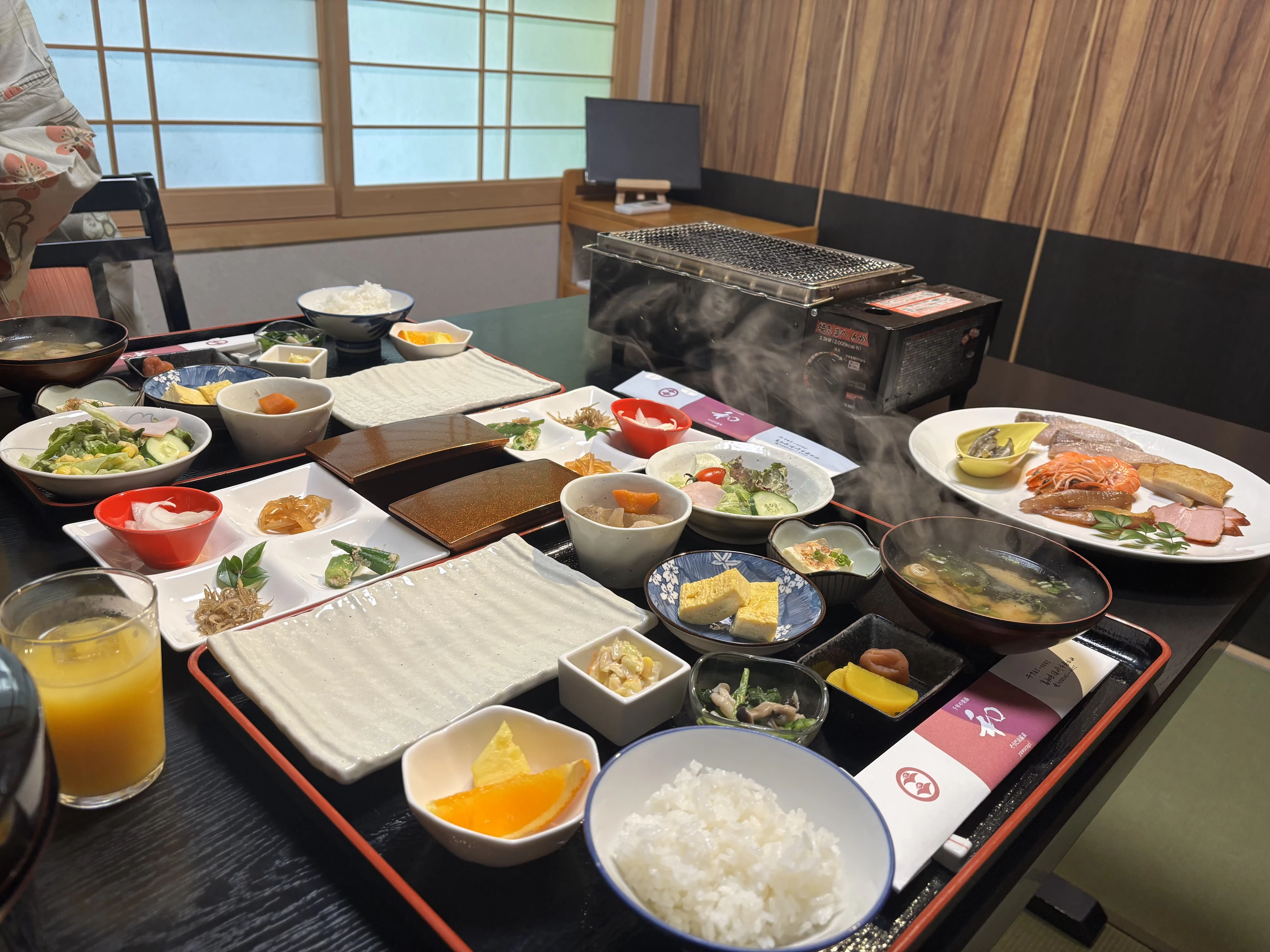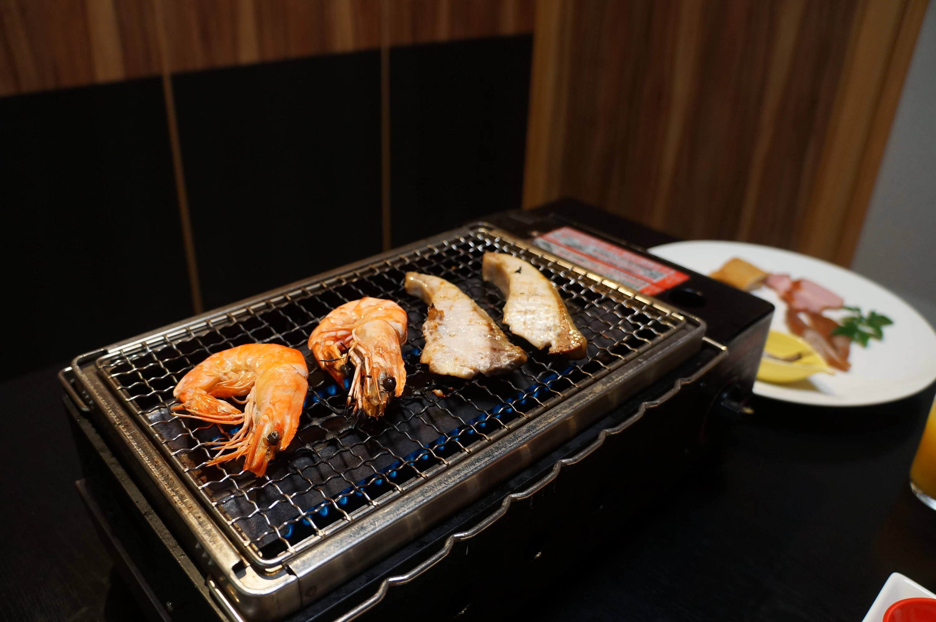 深海魚の「めひかり」や「ふぐのみりん干し」、「えび」や「かんぱち」などの海の幸に加えて、「ベーコン」や「じゃこ天」も並んでおり、朝から贅沢なラインナップです。ジューッと焼ける音と香ばしい匂いに、自然と食欲がかきたてられます。