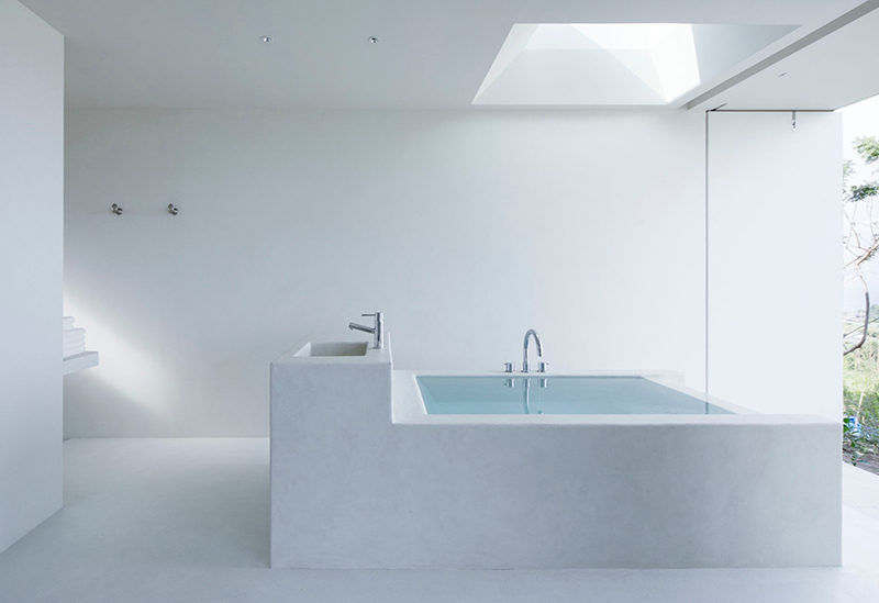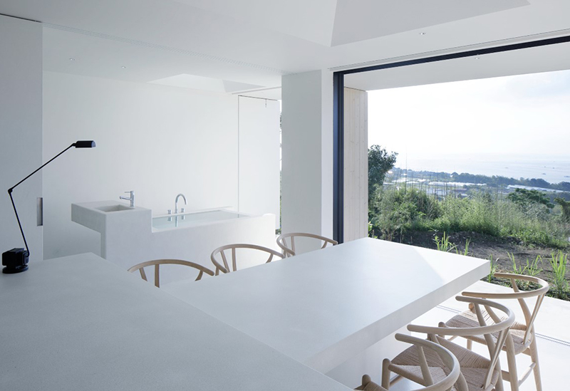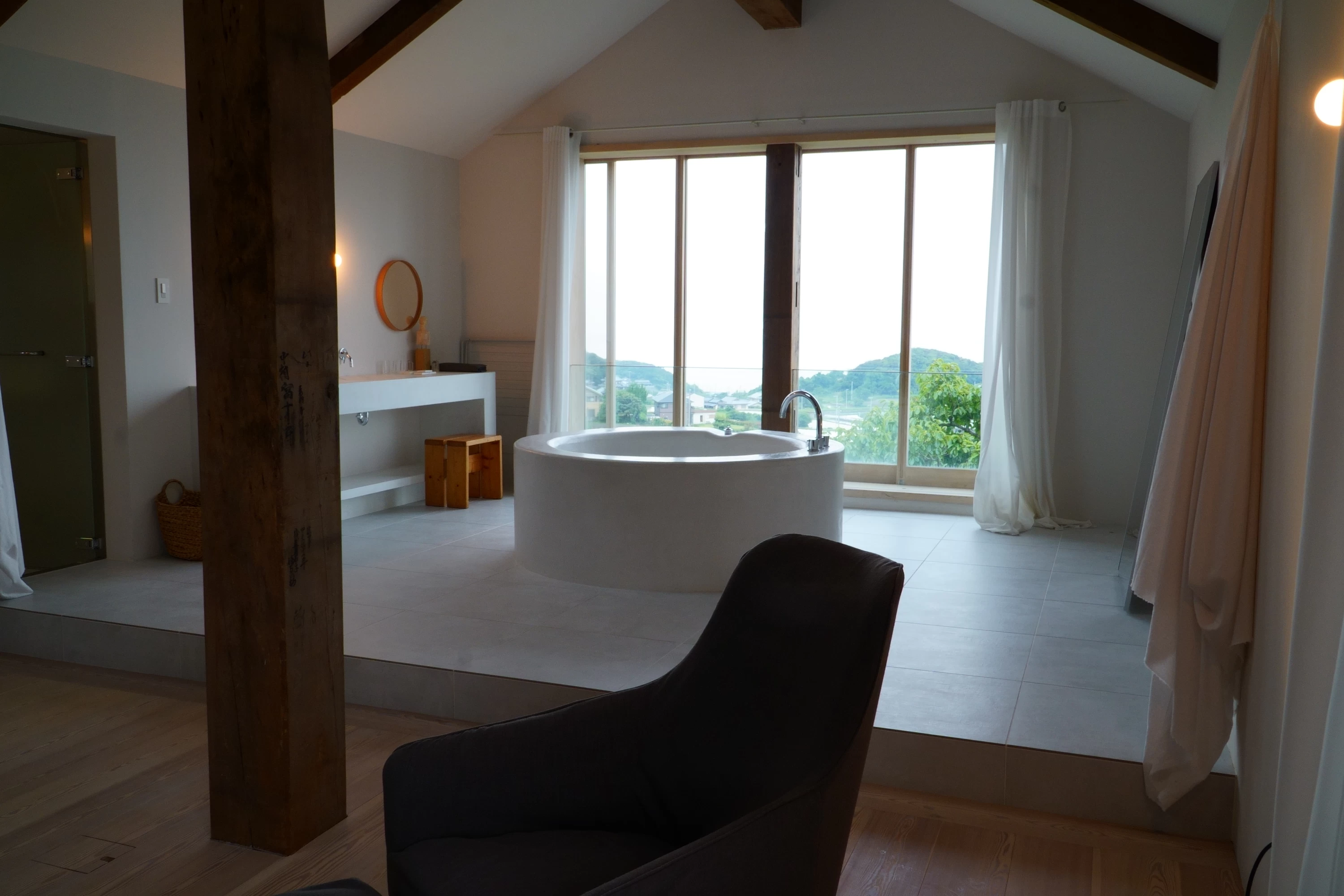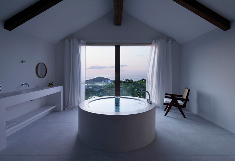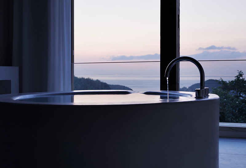2階へ上がるとまず目に留まったのが「KURA」のアイコニック的存在、円形のバスタブ。あえて仕切りを設けていない、開放的な空間の中にバスタブがメインにレイアウトされた斬新なデザインです。バスタブそばの窓の外には海が広がっているので、贅沢なバスタイムを過ごすことができます。