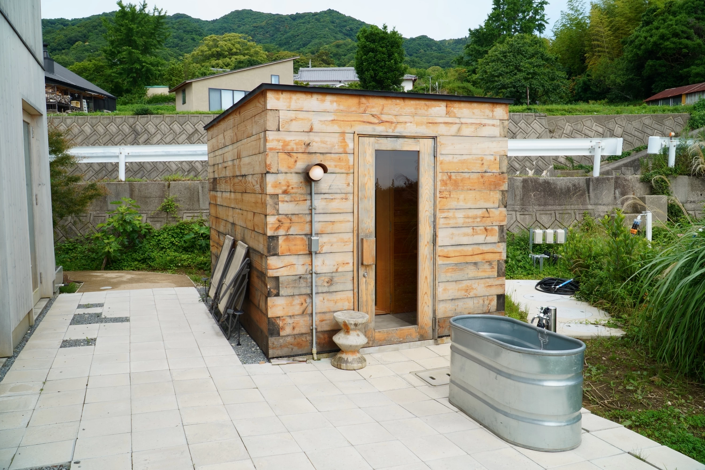 滞在したのは、築250年の蔵を移築・改装した「KURA」。1階には蒸留所、薪窯付きのダイニングキッチンが備わっており、「KURA」の宿泊者が利用できるサウナも併設されています。