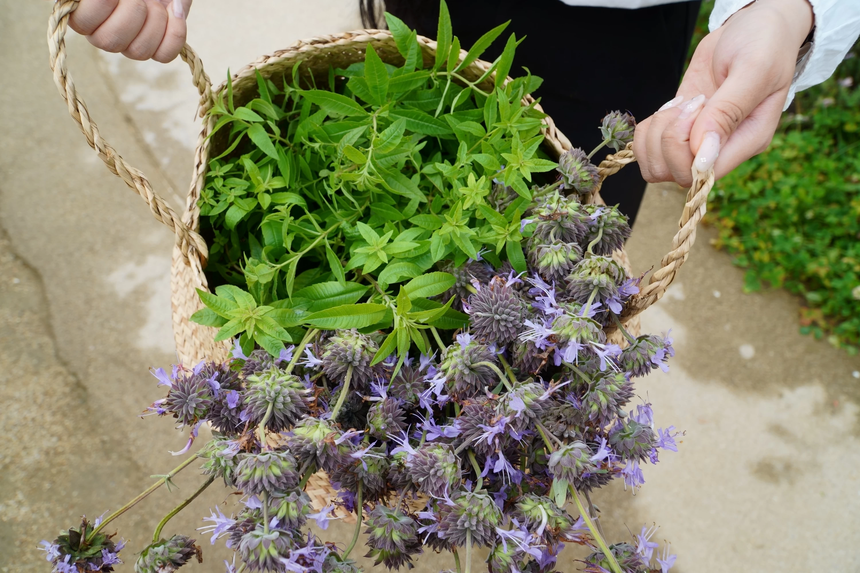 お気に入りのハーブを選んだら、さっそく摘み取りへ。この体験で驚いたのは、ハーブの収穫量。少量でいいのかと思いきや、蒸留には想像以上に多くの量が必要だそうで、カゴの中はハーブでいっぱいに。いい香りに包まれながらの作業は、それだけで癒やしの時間でした。
