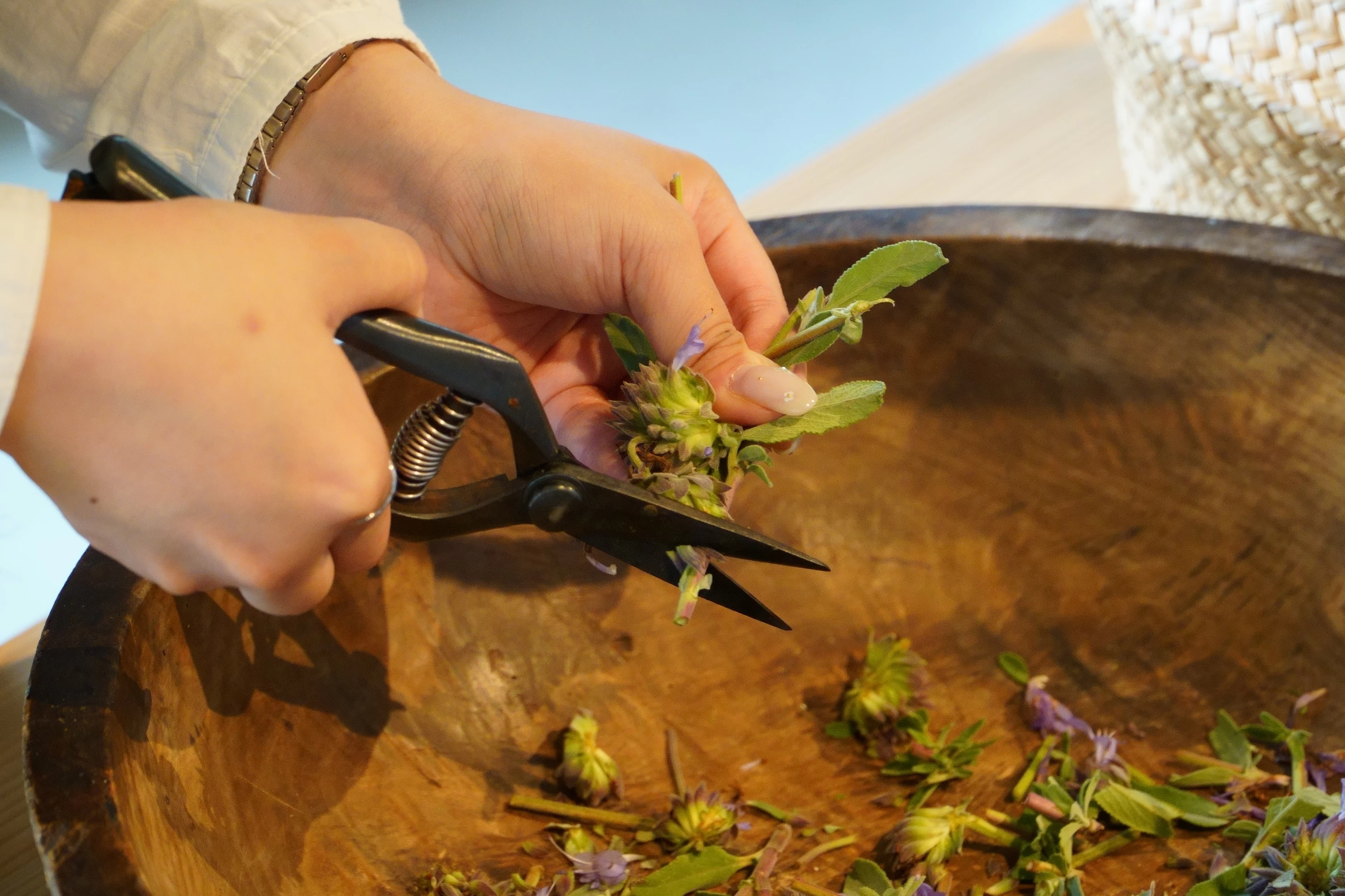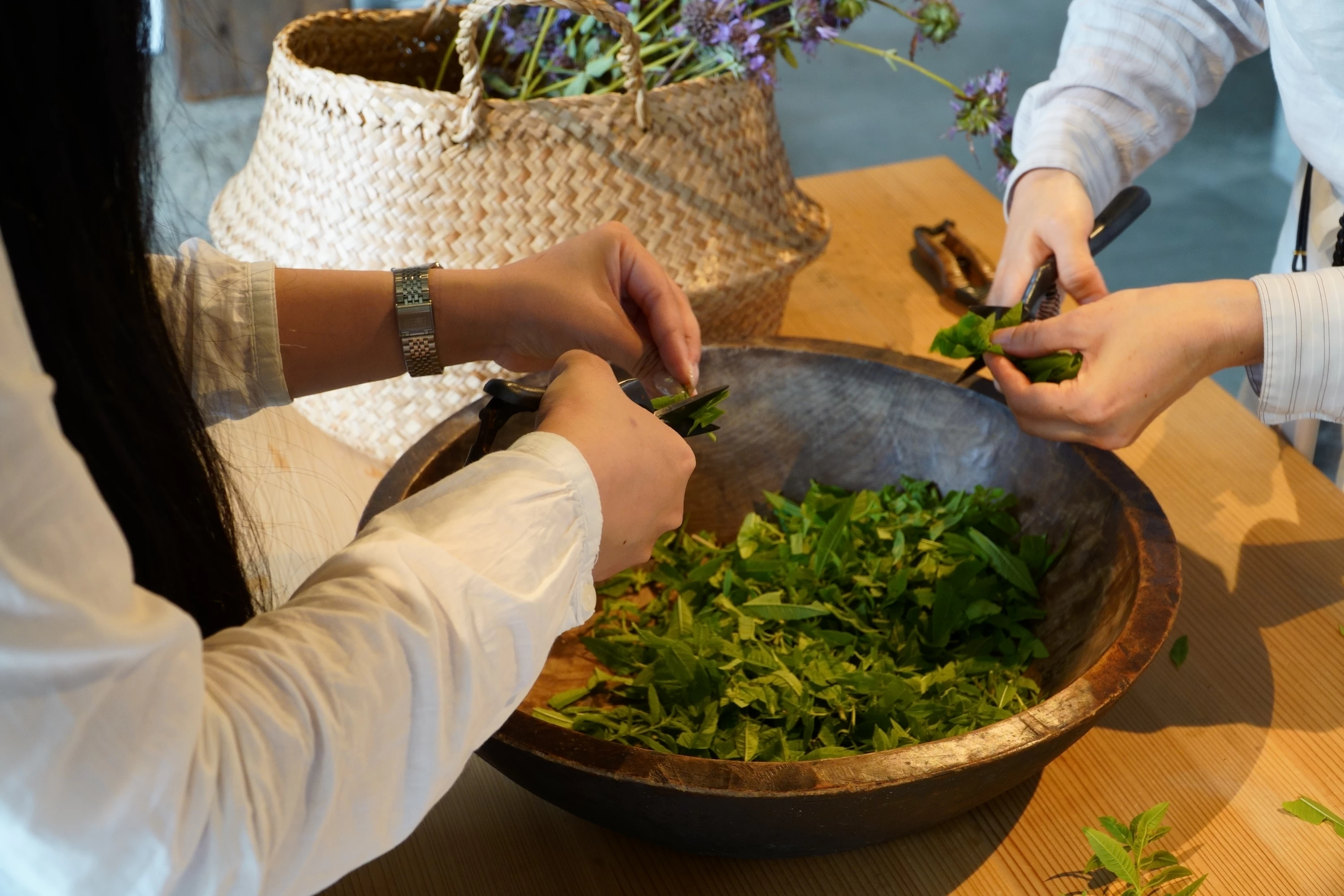 精油のもととなる揮発性芳香成分は、裁断することでより引き出されるそう。摘みたての新鮮なハーブを次々とカットしていく作業は、なかなかできない非日常体験でした。手元に意識を集中させ、無心で没頭していると、ハサミの音だけが室内に響きます。静けささえも心地良い、贅沢に感じられるひとときです。