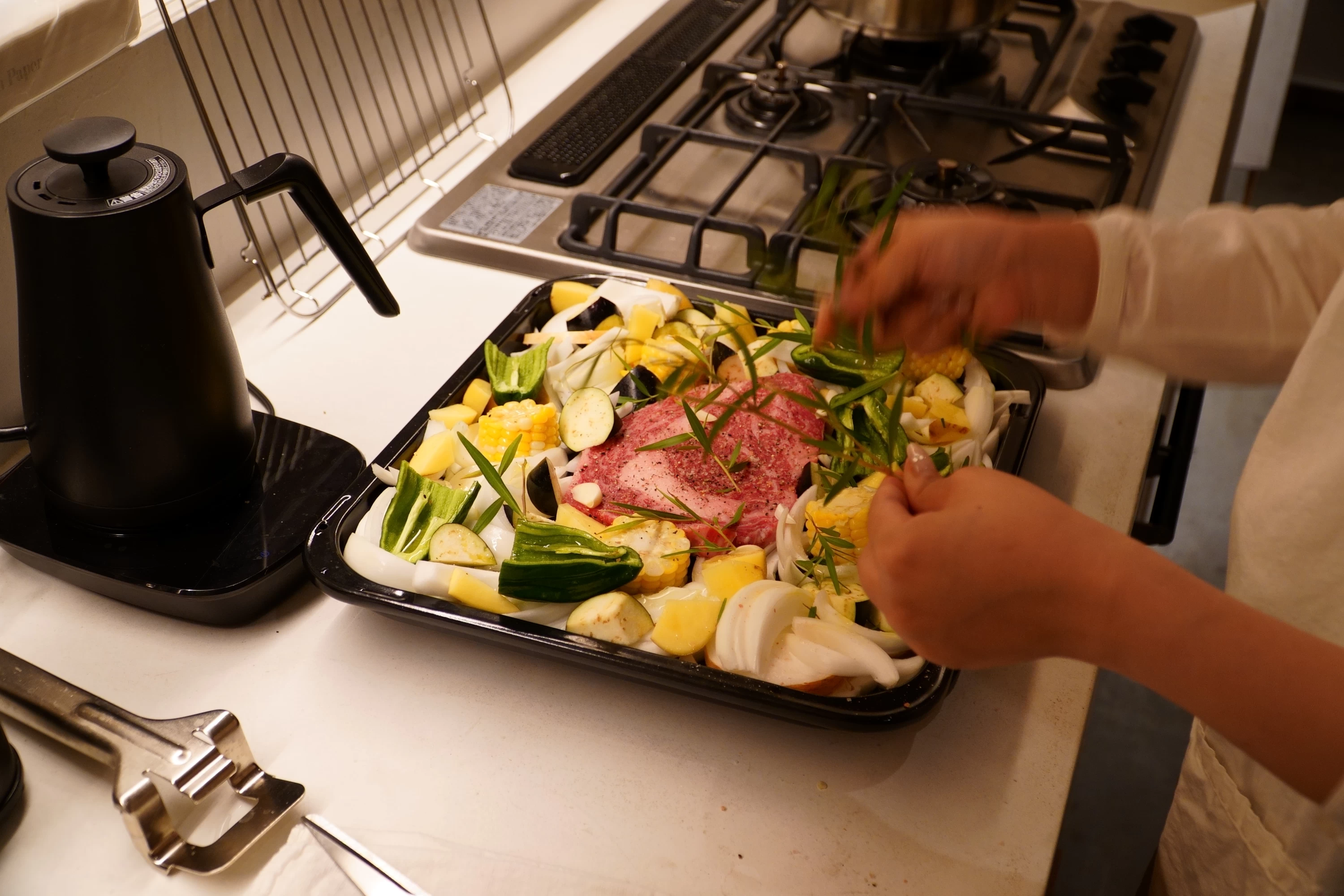 オーブンに入れたのは、ローズマリーとともに並べた色とりどりの野菜と淡路島牛。