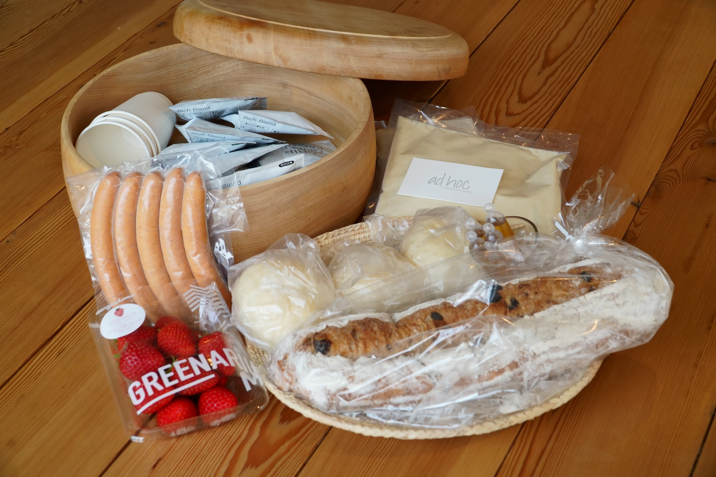 オプションで朝食/TERROIR AWAJI Breakfast Setを選んでおくと、冷蔵庫にはソーセージやリコッタチーズ、いちごなど、淡路島の食材があらかじめ用意されるのでとても便利です。