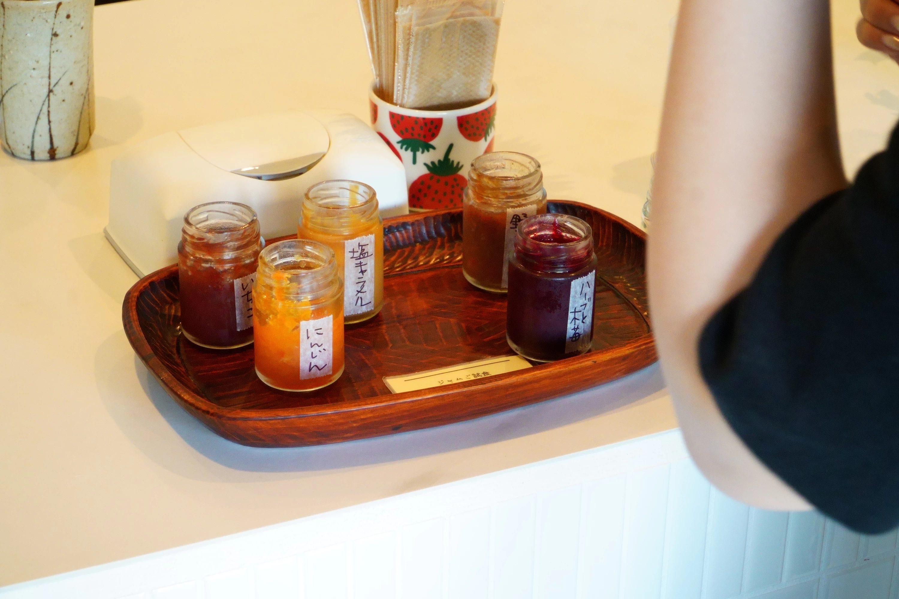 店内では、いちご・にんじん・塩キャラメル・野菜ミックス・ハーブと木苺の5種のジャムを試食。完熟の自家栽培いちごをふんだんに使ったいちごジャムは、ここでしか味わえない贅沢な一品です。