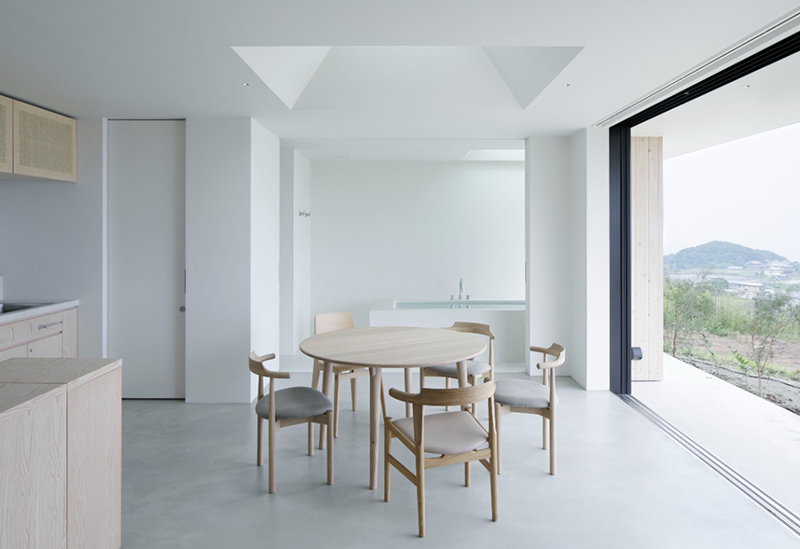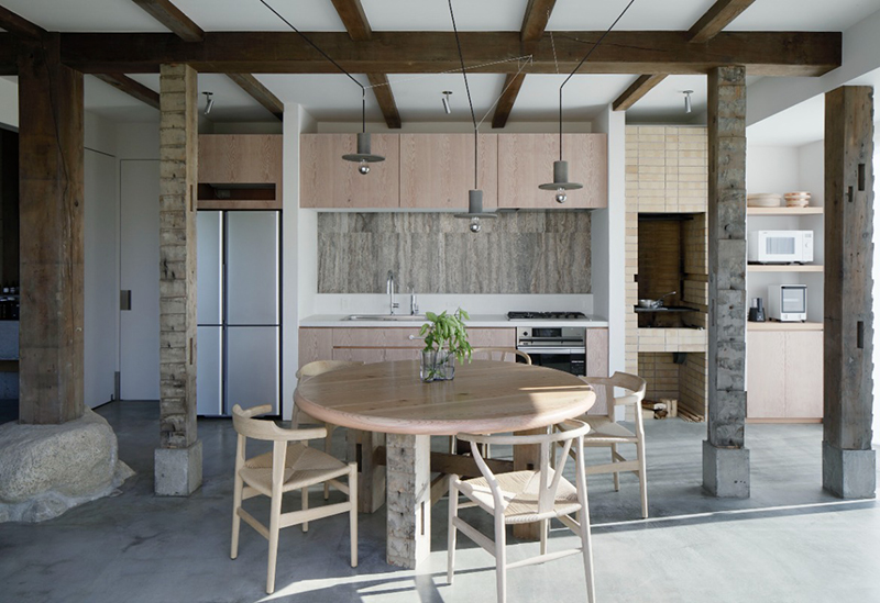 存在感のある大きな柱や梁、白を基調とした壁は、いずれも職人の手仕事によるもの。現代的な意匠の中に、どこか懐かしい趣が溶け込んでいました。大きな扉や窓からはたっぷりの自然光と心地良い風が流れ込み、空気の巡りを肌で感じられる空間に。日常の喧騒を忘れ、ゆったりと寛げます。