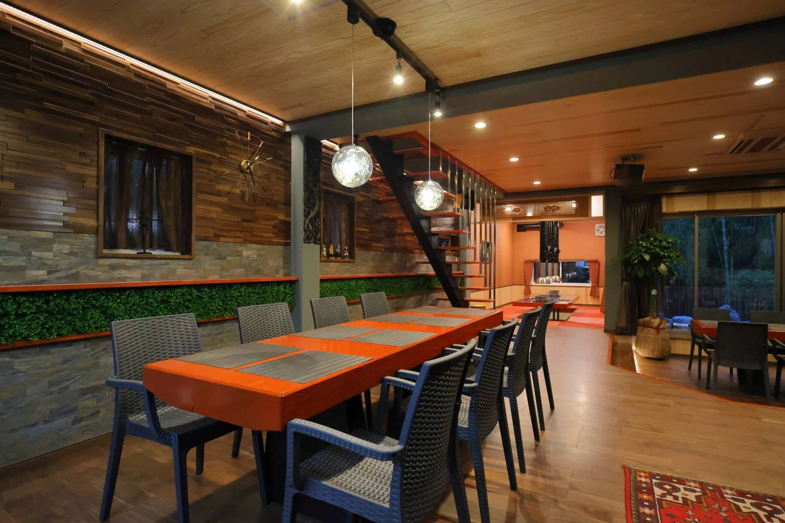 竹林を抜けて辿り着いたのは、竹林の中に佇む2階建てのコテージ。ドキドキしながら扉を開けると、そこには広々としたダイニング、リビング、キッチンが。私たち9人が全員で集うのにピッタリのサイズ感です! 大きな窓からは柔らかな自然光が差し込み、竹林を望む穏やかな景色が広がり、非日常感が満載。なかでもテンションが上がったのが、本格的な設備が備わった全天候型で楽しめるBBQルームです。