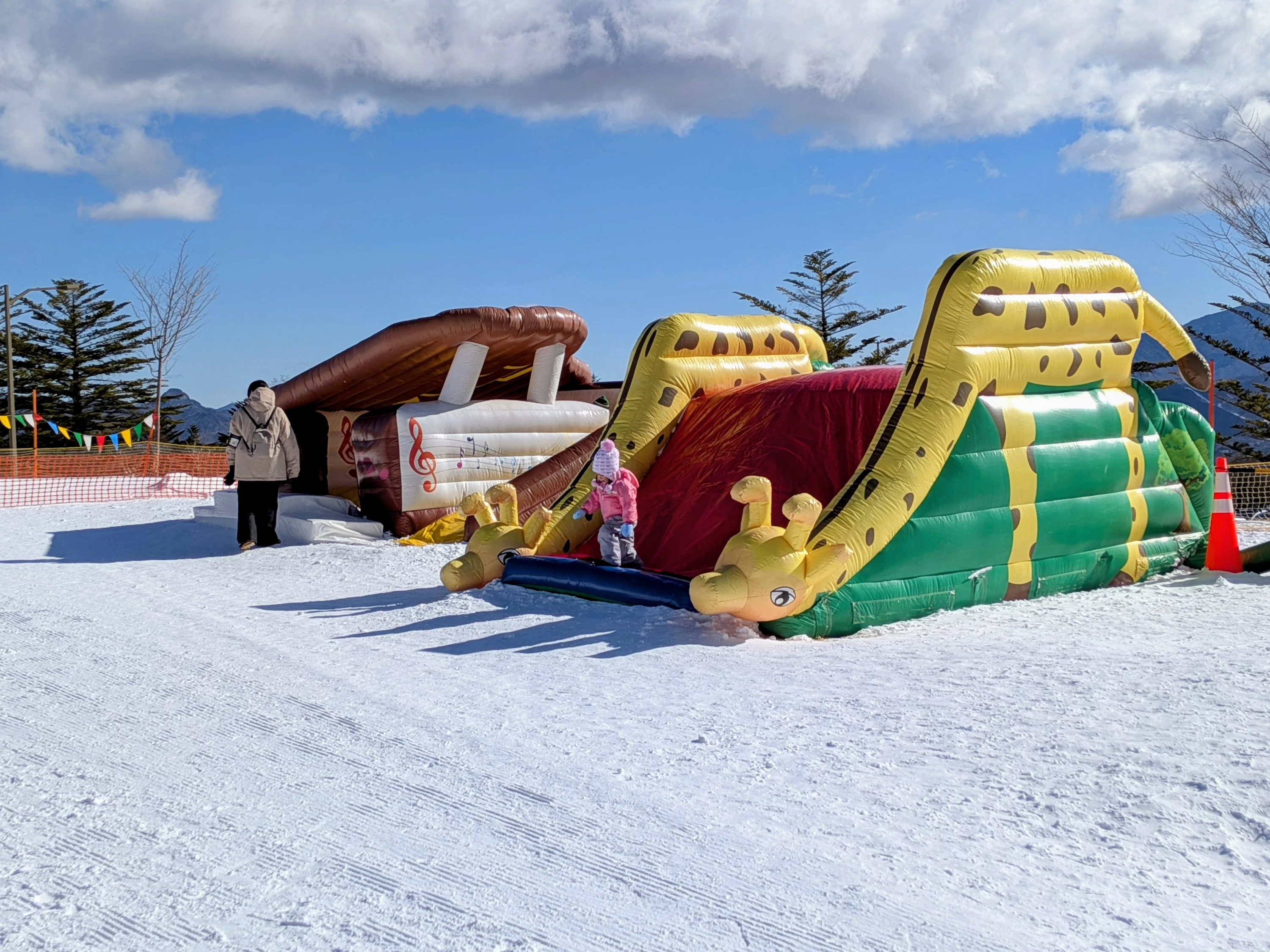 よく見かけるふわふわ滑り台の遊具も雪の上となるとまた違った楽しみがあるようで大はしゃぎです。