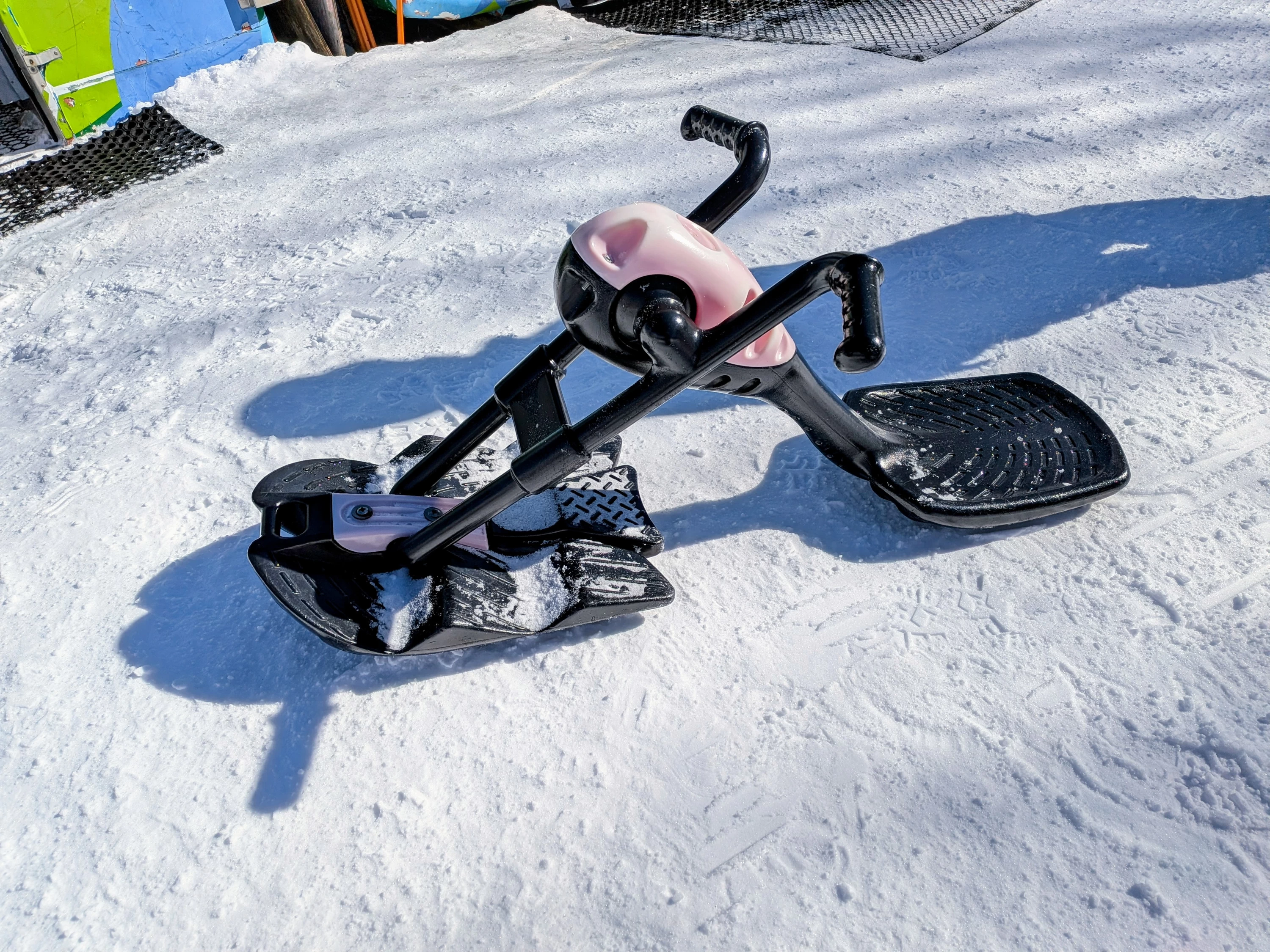 自転車感覚で雪上を駆け抜ける爽快感があるスノーストライダーは自分で滑ることもできますし、親やお兄ちゃんが引っ張ってあげたり。周囲にも一生懸命引っ張るママやパパの姿が。