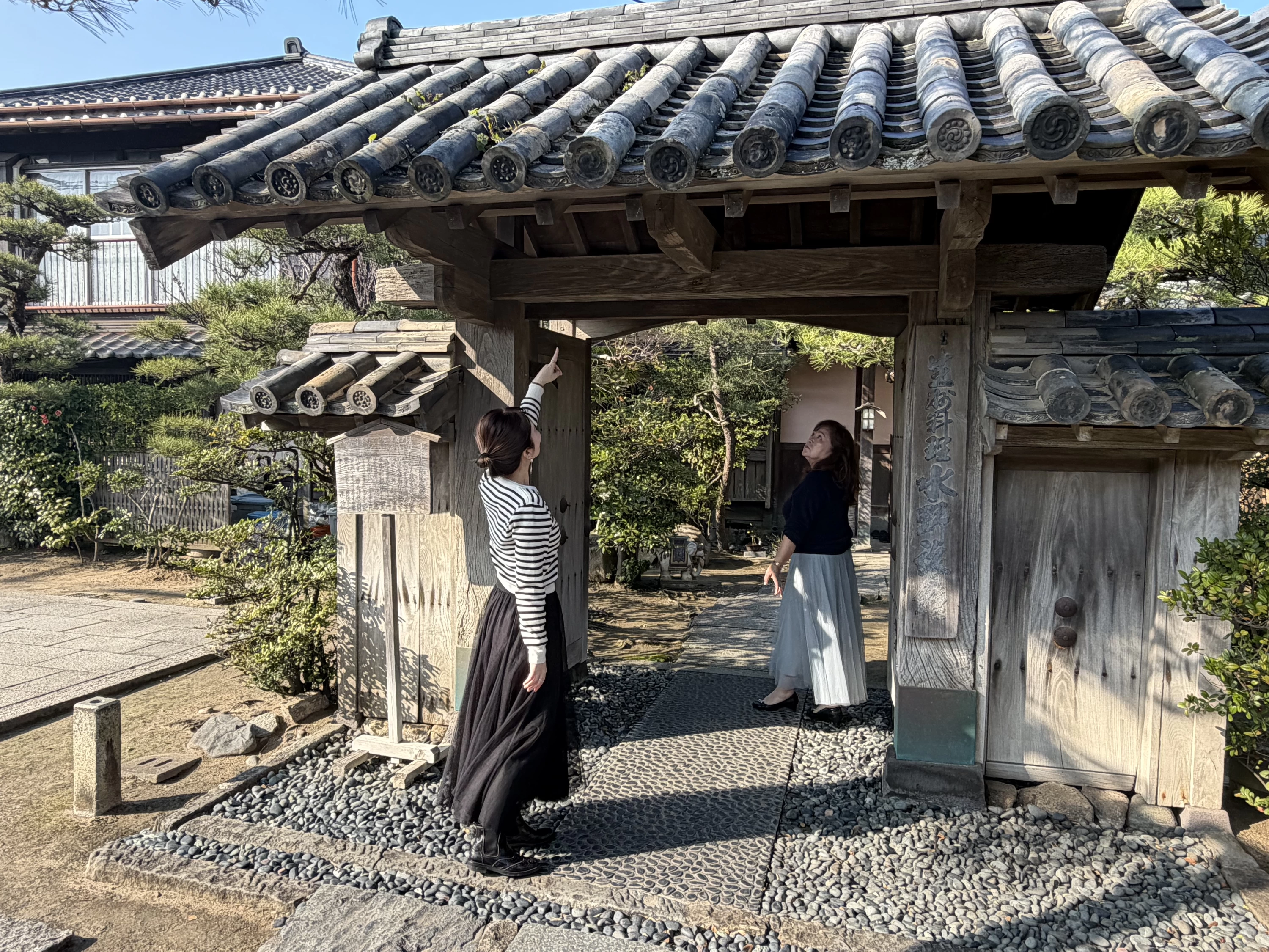 約400年前、名護屋城から移し築いたという武家屋敷門。重厚な佇まいの中にどこか趣があり、不思議と威圧感はありません。「すごく立派だこと…」と母が小さくつぶやき、二人でしばらく屋根を見上げながら、ゆっくりと門をくぐりました。屋根瓦をよく見ると、それぞれに表情があり、長い歴史を重ねてきた門であることが伝わってきます。こうした背景を知ることで、古い建物の趣がより深く感じられる気がしました。