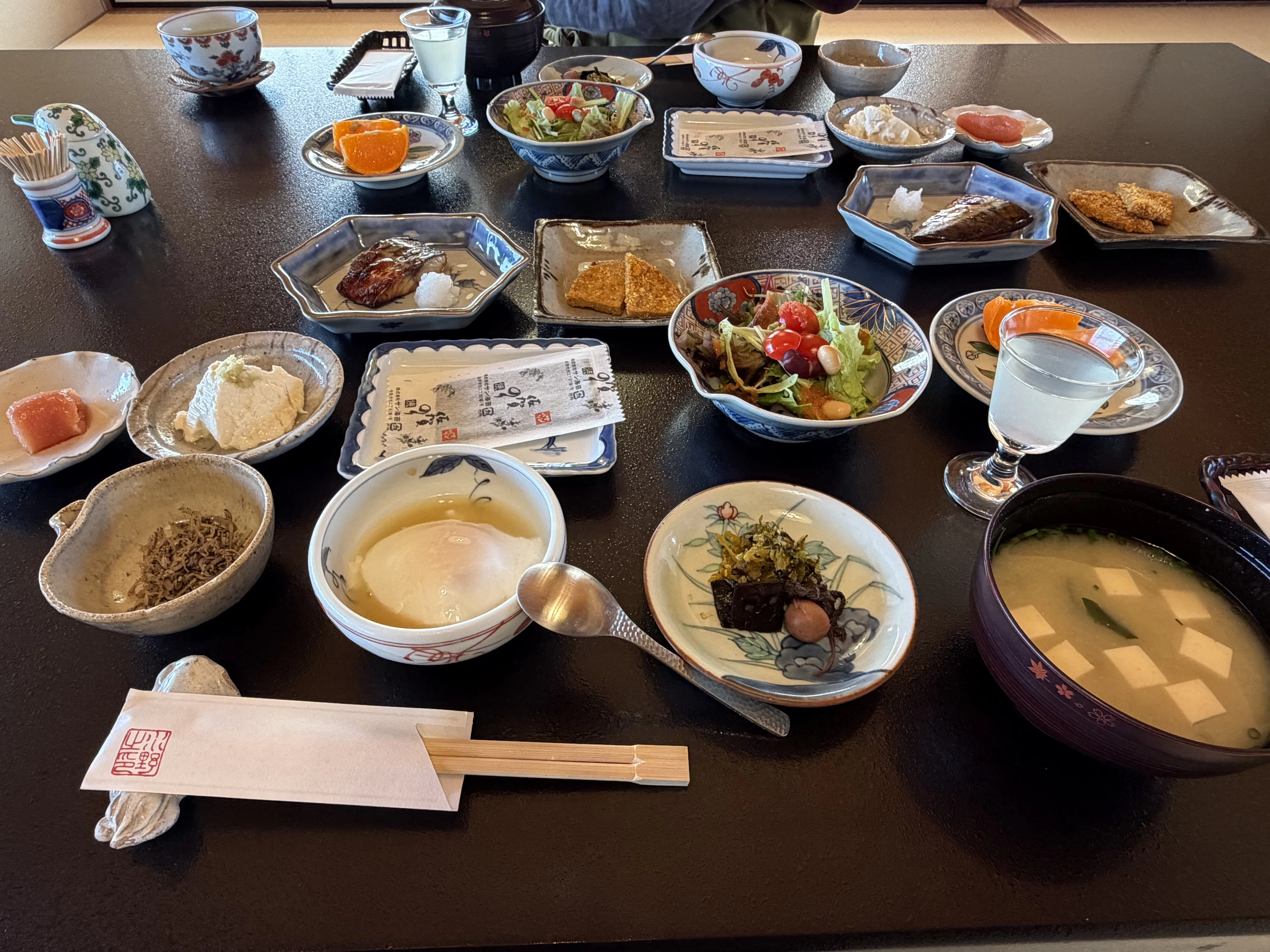 席に着くと、昨夜とは違う表情の唐津湾が窓の外に広がっていました。朝の光を受けた海は、夜よりずっと穏やかで、眺めているだけで気持ちが静かに整っていく感じがしました。運ばれてきたのは、丁寧な和の朝食。焼き魚は身がふっくらとして、箸を入れた瞬間からいい香りがしました。「朝からこんなに美味しい魚が食べられるなんて」と母と話しながら、ゆっくりと味わいました。母と「もう少し食べられるけど、これくらいがちょうどいいね」と話しながら食べ終えました。食べすぎない、でも十分。そんな朝食でした。