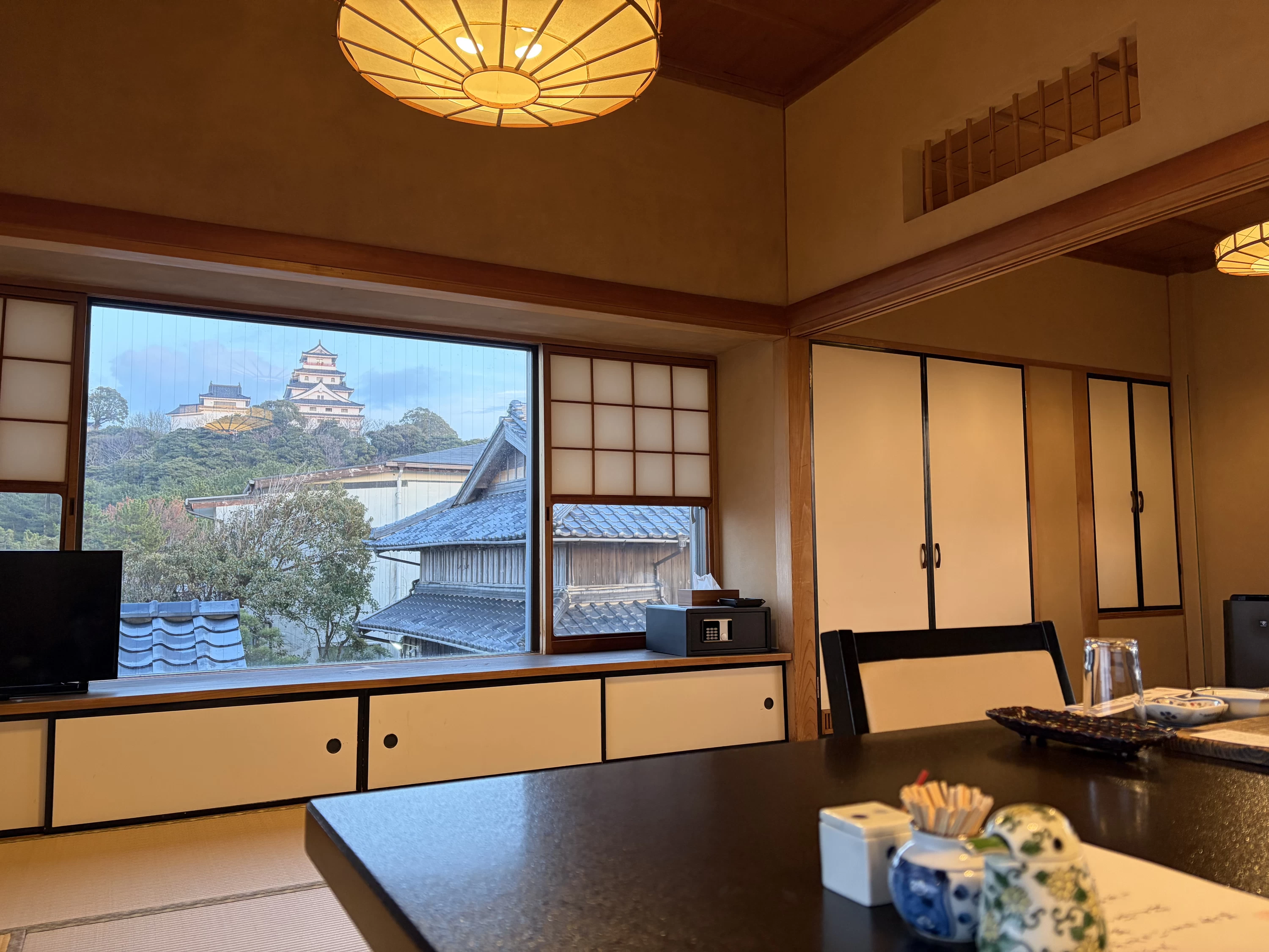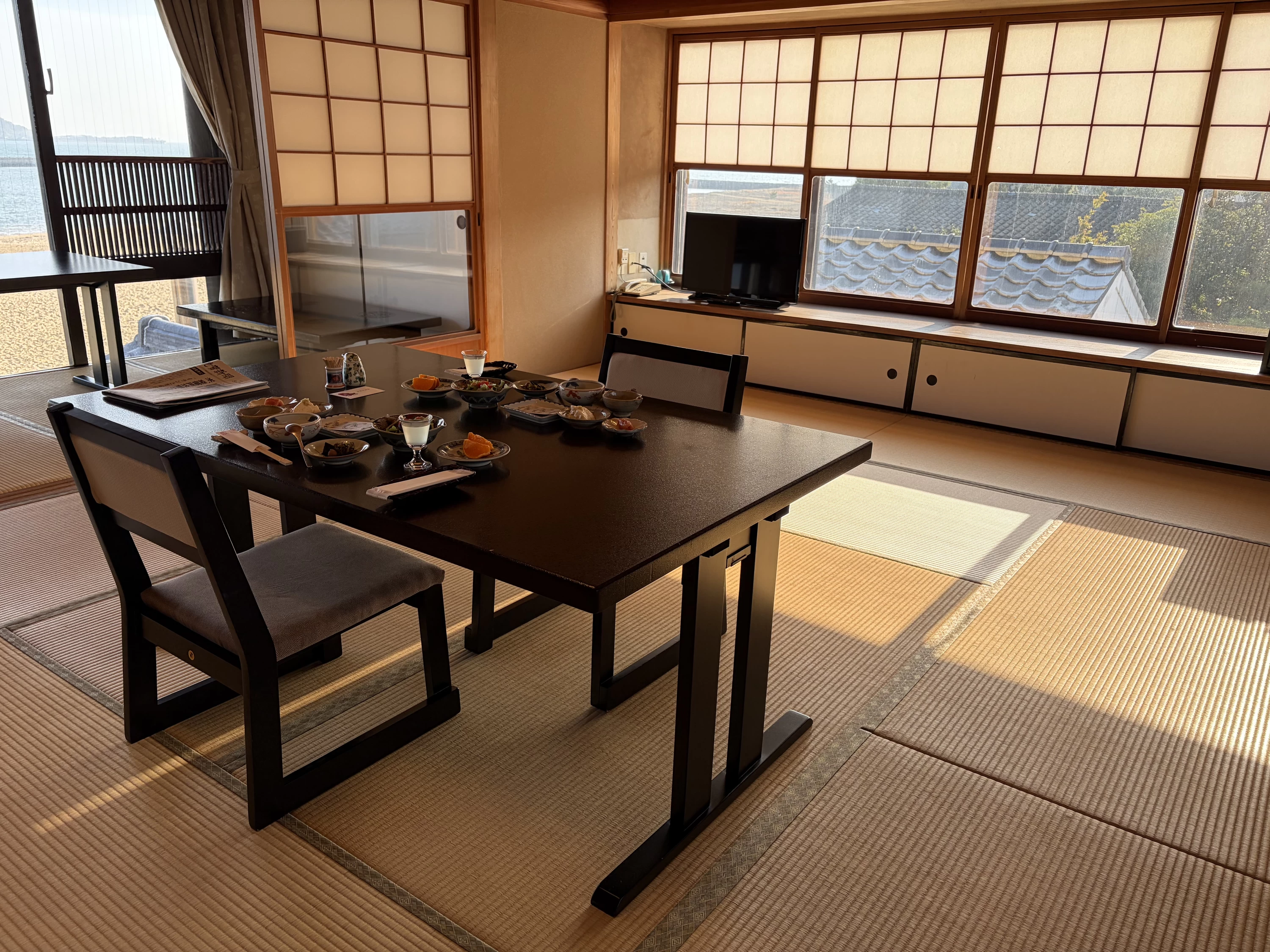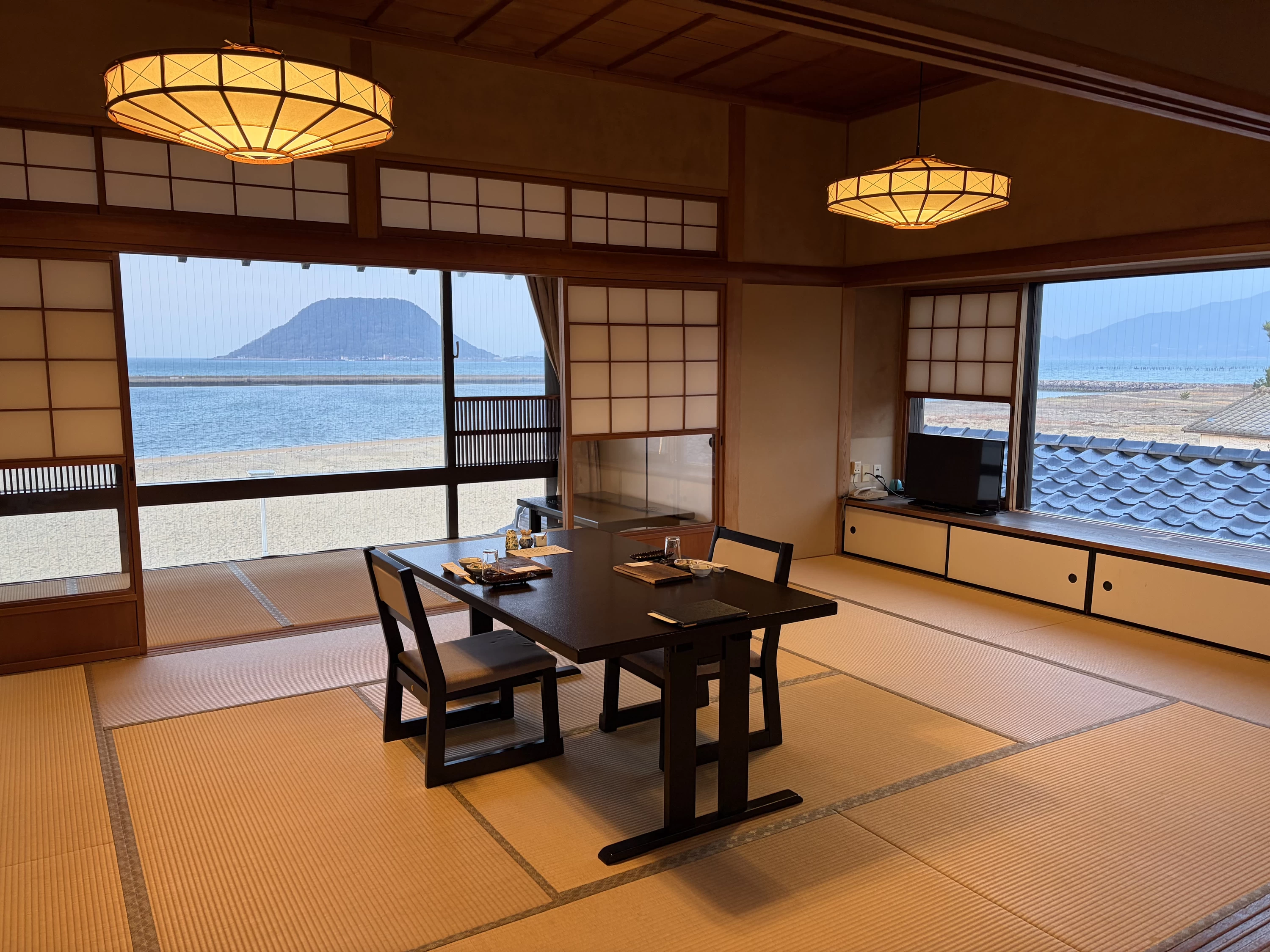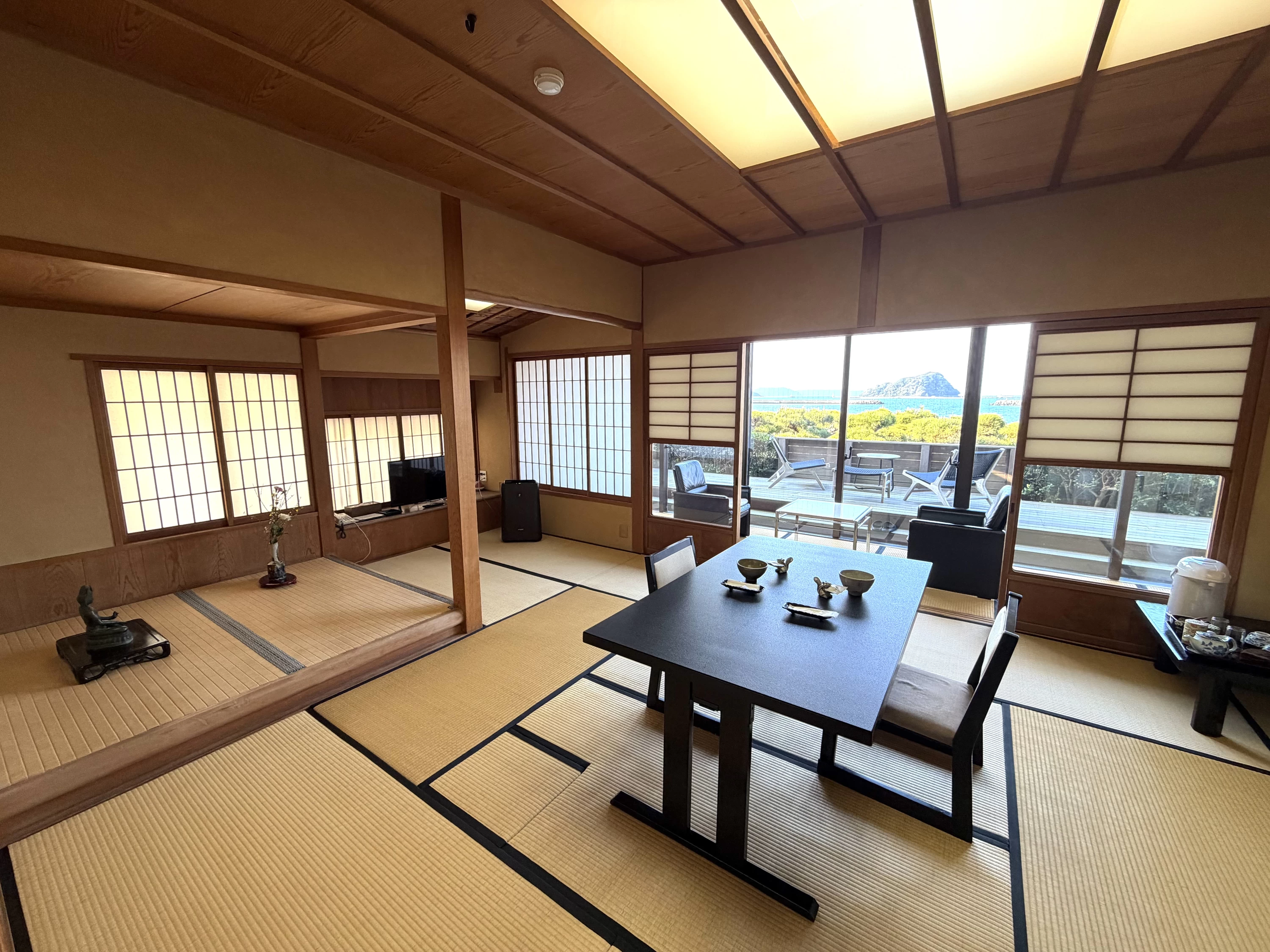 - 窓いっぱいに広がる唐津湾。海が見える和室、初めての体験