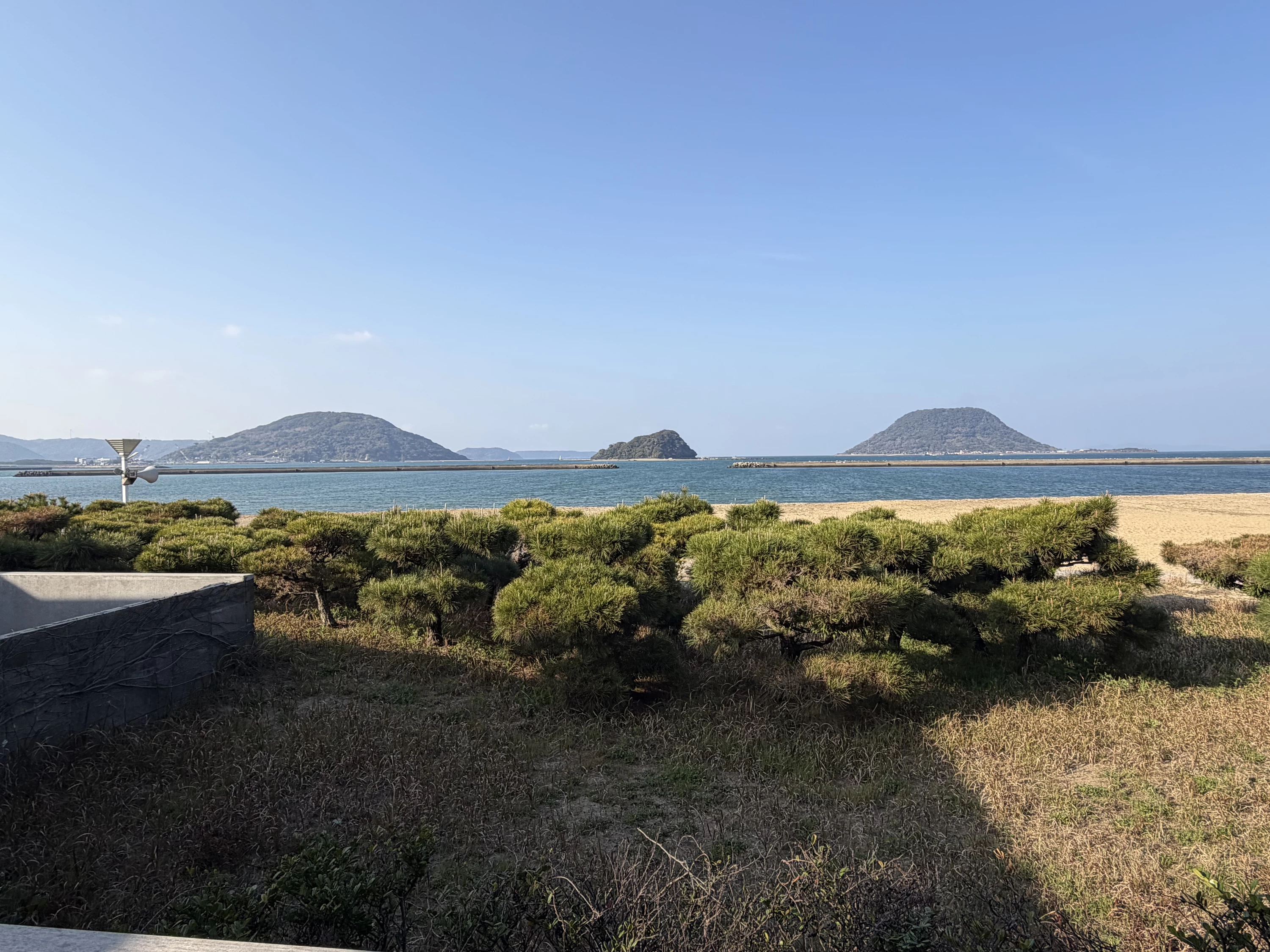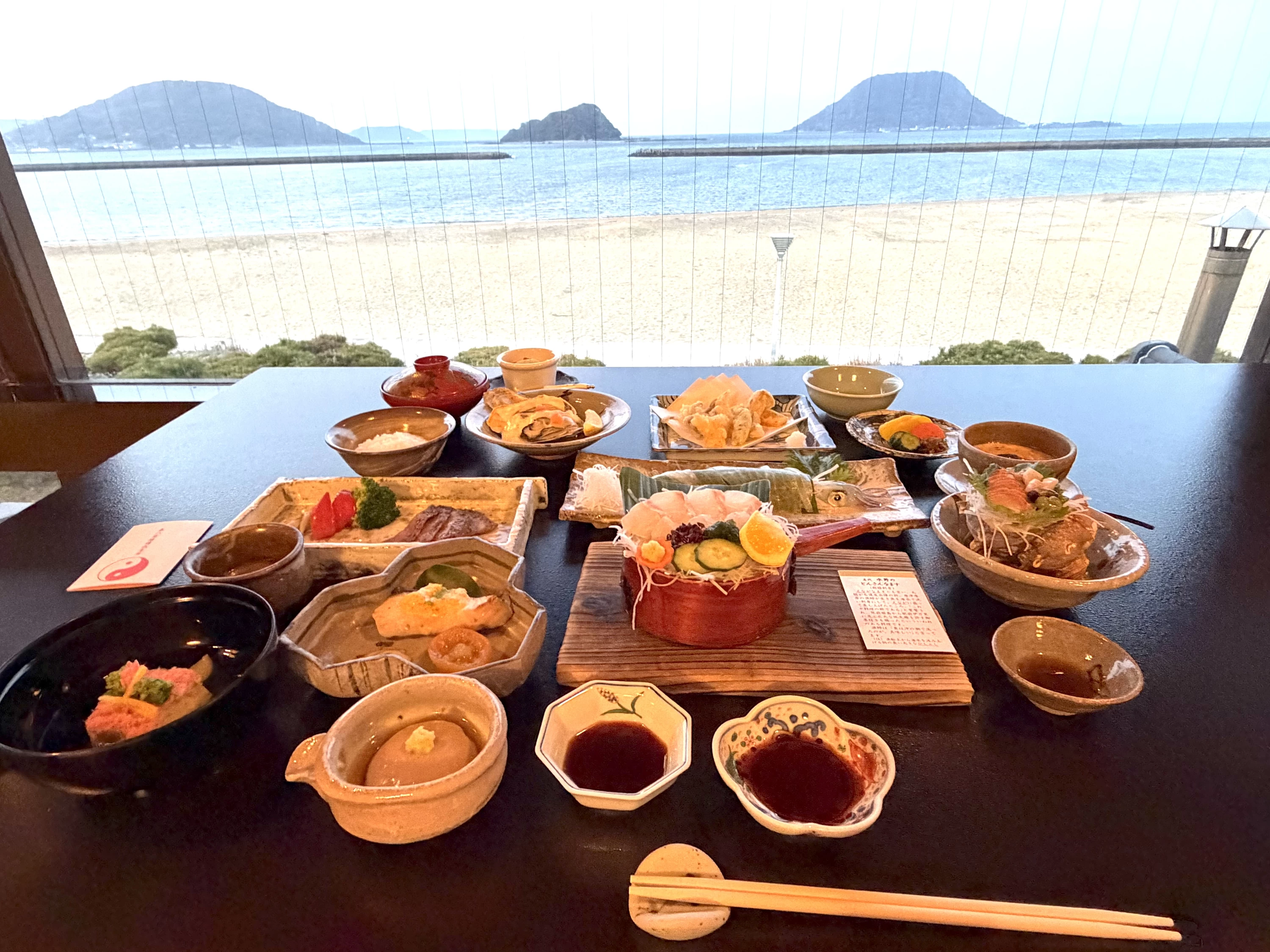 そこには、窓いっぱいに唐津湾が広がっていました。「わあ!全部海!」「綺麗な景色ねー」——気づいたら二人でテラスに出ていました。オーシャンビューのホテルには泊まったことがありますが、窓いっぱいに広がる海を畳の上で見ることができる旅館は、初めてでした。同じ「海が見える部屋」でも、和室で眺める海は、どこか違う顔をしているような気がしました。海とこんなに近い場所に、こんなに静かな和室があるということを、この部屋に来るまで知りませんでした。白い砂浜がゆるやかに伸び、そのまま海へと溶け込んでいきます。北には玄界灘、東にはうっすらと唐津城。「海が見える旅館がいいな」という母のひと言から始まった旅が、この景色に辿り着いたのだと思うと、連れてきてよかったと心から思いました。