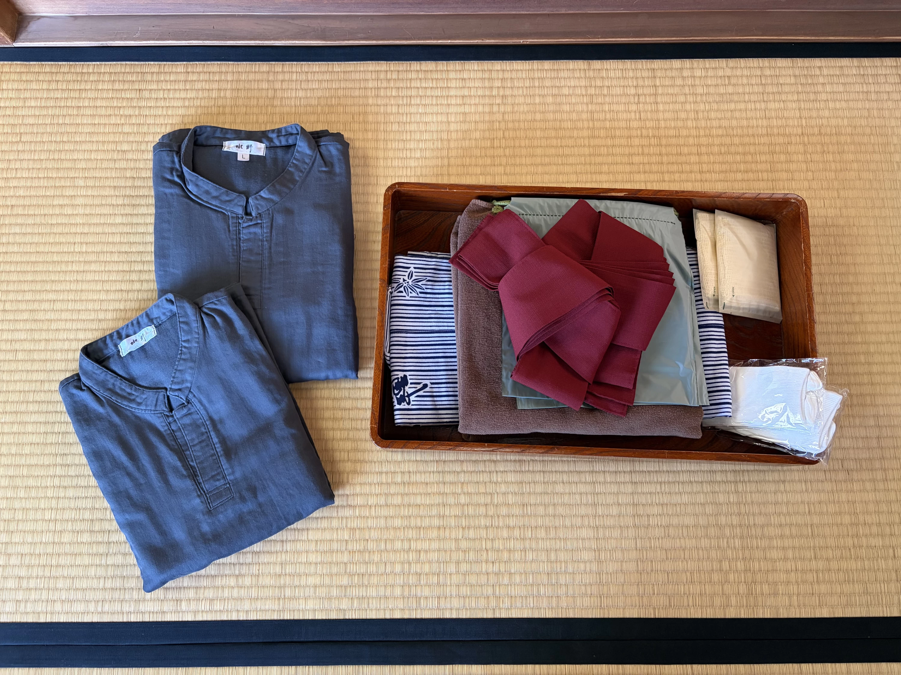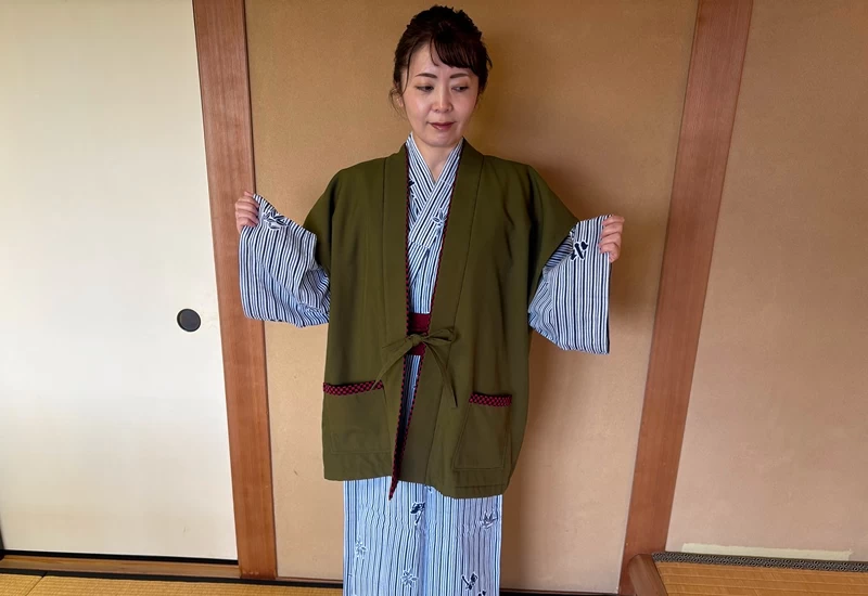 お部屋着は、落ち着いたネイビーの作務衣と、ストライプ柄の浴衣の2種類。浴衣にはオリーブグリーンの羽織とえんじ色の帯が合わせられており、着るだけで旅館の雰囲気にすっと馴染む。夕食は浴衣でいただき、就寝は作務衣で。浴衣で寝るとはだけてしまうので、寝るときに作務衣に着替えられるのが地味に嬉しかったです。