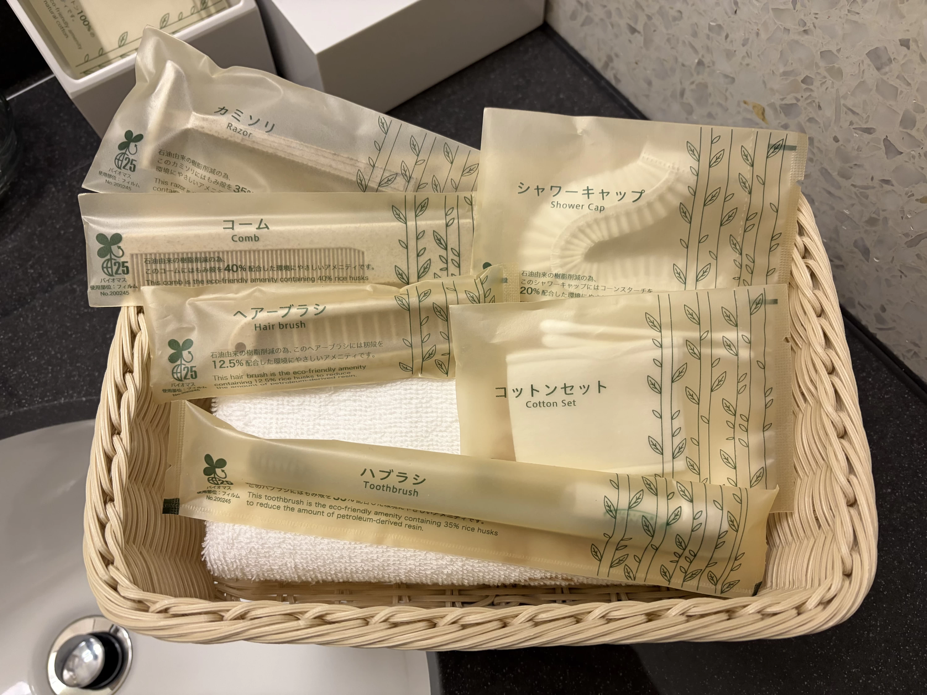 洗面台に置かれたアメニティは、バイオマス素材を使ったエコフレンドリーなもの。歯ブラシやコーム、ヘアブラシなど、細部にまで気遣いが行き届いていました。