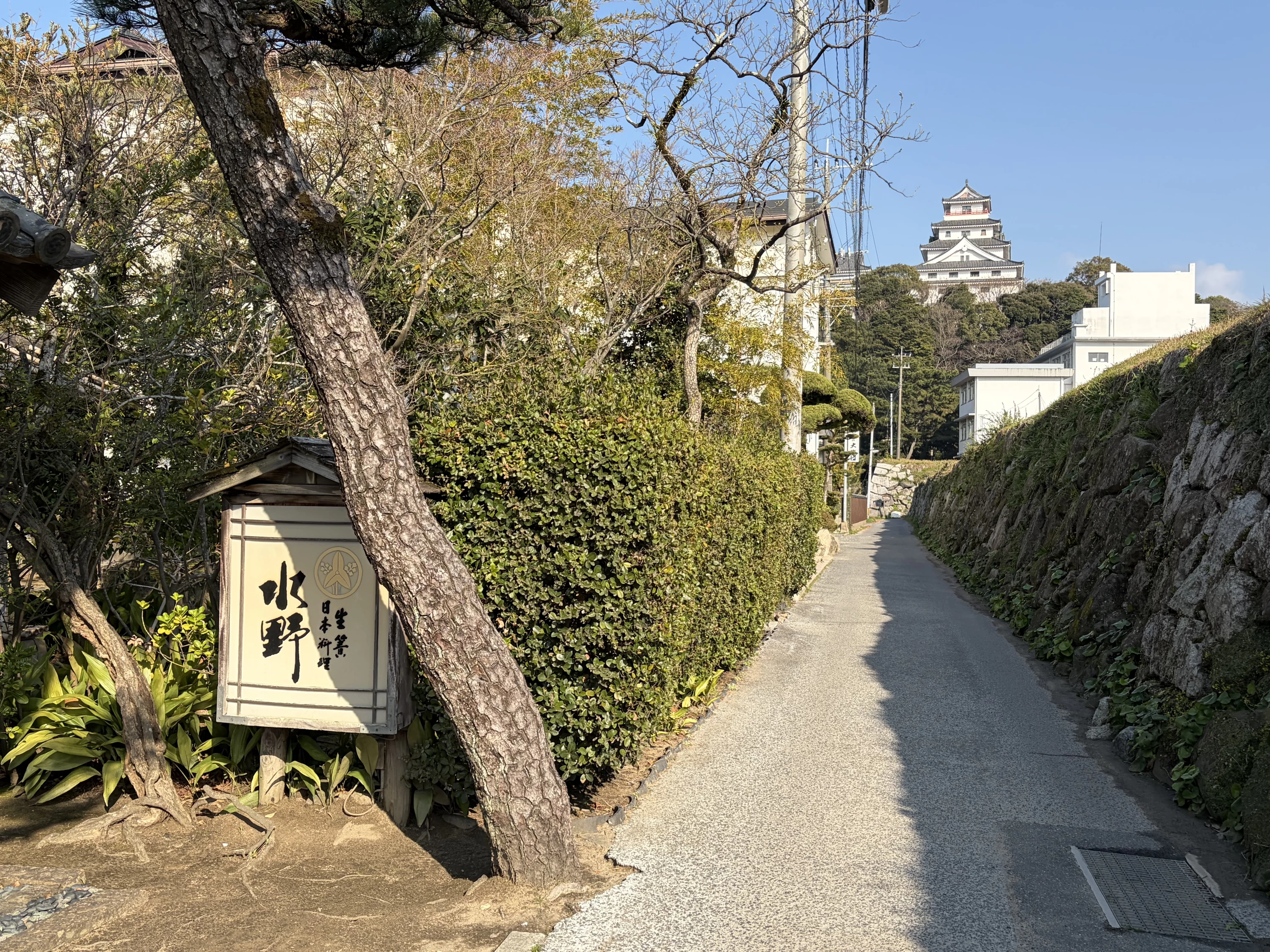 林を抜けるたびに、日常が少しずつ遠ざかっていくような、そんな感覚がありました。車窓が海辺の景色へと変わっていくと、その先に現れたのが、唐津城のそばに静かに佇む純和風旅館「水野旅館」でした。