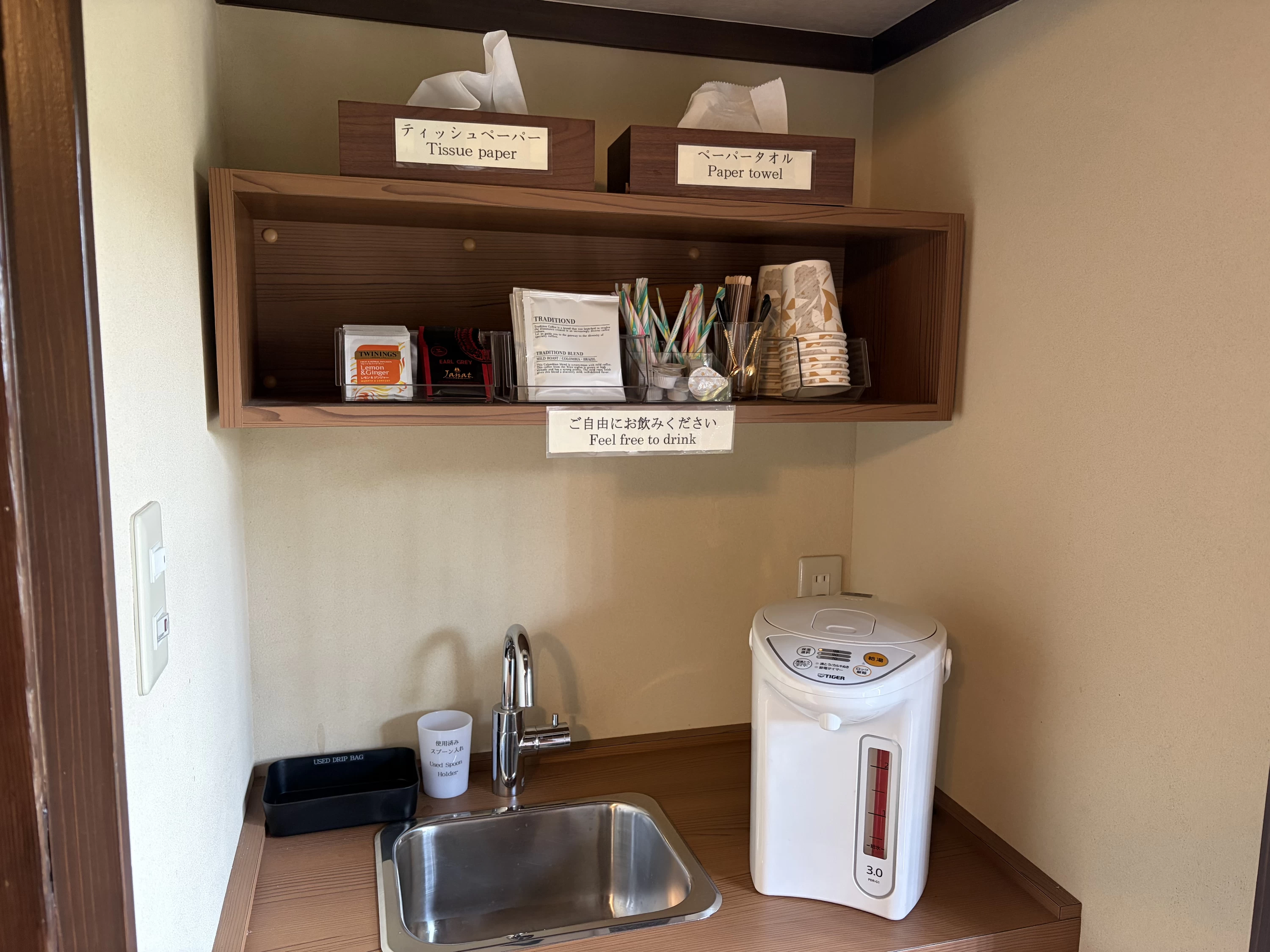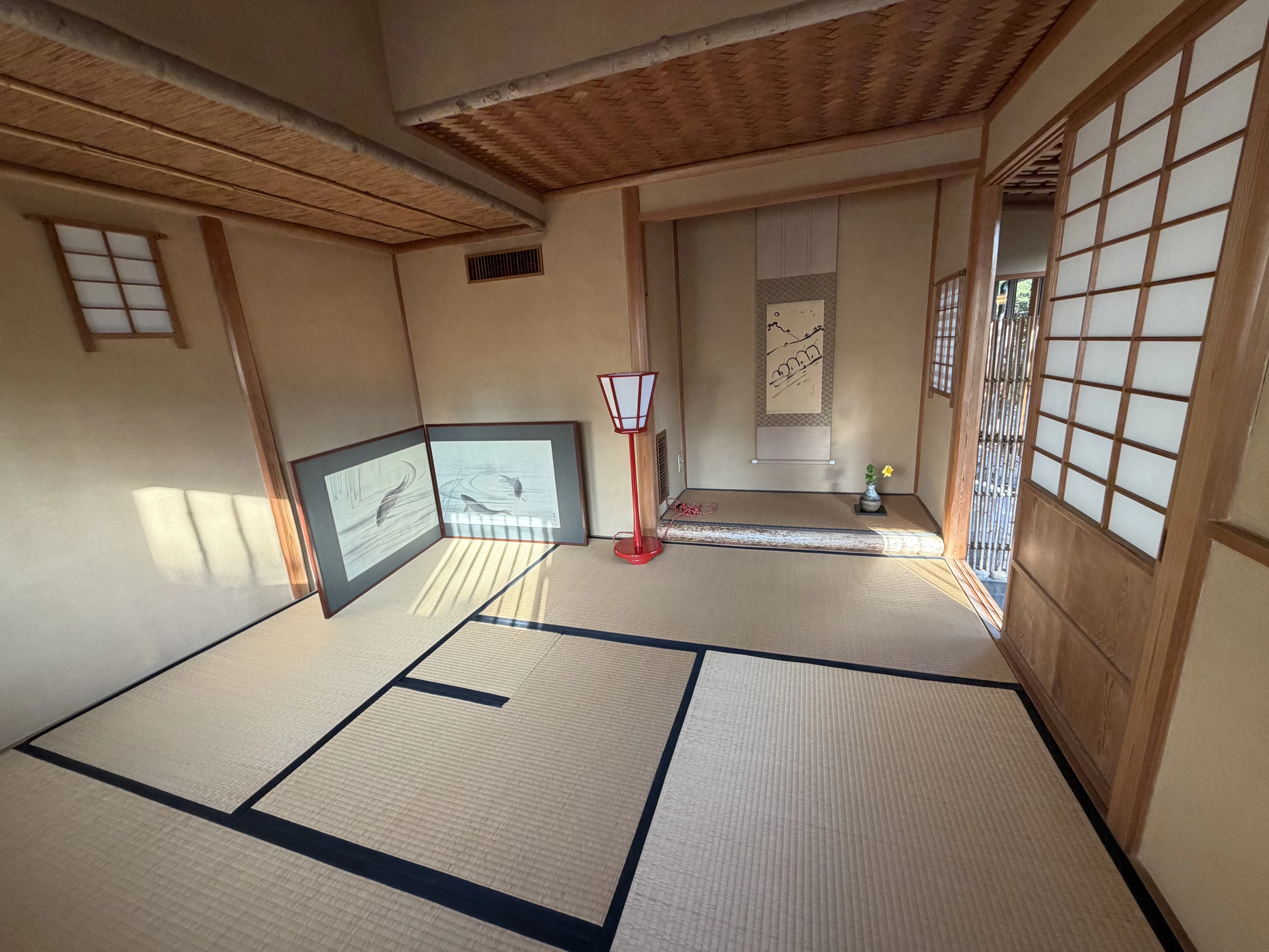 部屋の奥に、小さな茶室がありました。二人でそっと入ってみると、海とは反対側を向いた、静かな空間でした。お茶を点てるわけでもなく、ただ二人でそこに座って、しばらくぼーっとしていました。何もしない時間が、こんなに心地よいと思ったのは久しぶりでした。いつも誰かのために動いている母が、何もせずにただそこにいる。それだけで、この旅に来た意味があった気がしました。