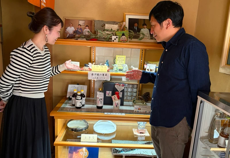 水野旅館は、全8室の小さな宿です。社長は息子さん、女将はそのお母さん、そして会長がお父さんという、家族で営む旅館でした。 チェックアウトの前に、館内のお土産コーナーで唐津焼をあれこれ眺めていると、たまたま通りかかった社長さんが器のことを丁寧に説明してくださいました。お話を聞いているうちに、唐津焼の魅力をより深く知ることができ、もともと好きだった器が、さらに好きになりました。